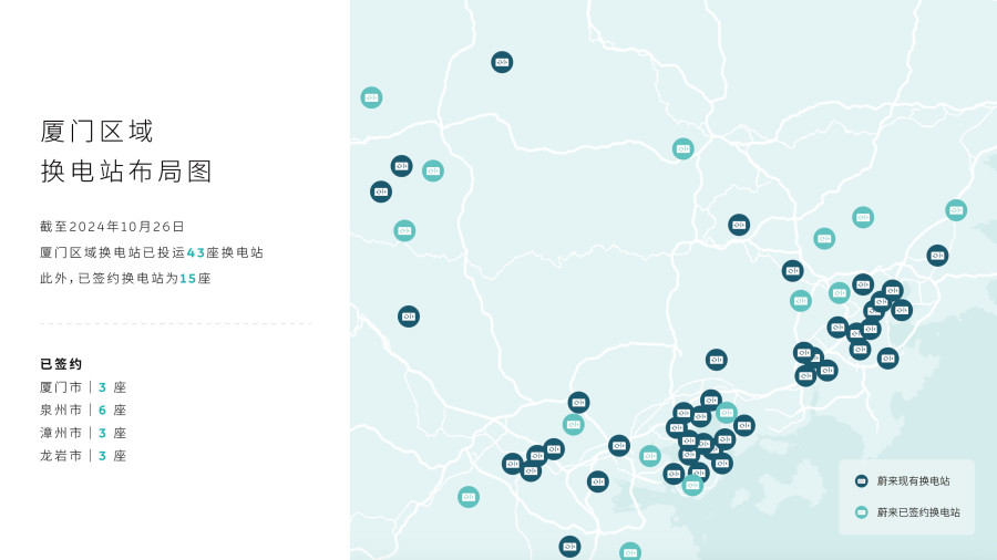阻止10月25日,厦门区域(厦门泉州漳州龙岩)累计建成换电站43座,超充站24座;接入第三方充电桩24,323根。